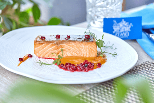 Place the salmon fillet in the center of the plate and arrange the pumpkin puree and lingonberries around it.