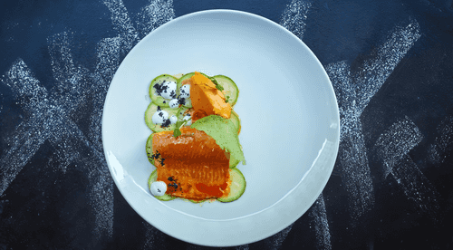 For serving, lay zucchini circles as a 'carpet', top with carrot puree, place trout beside it, and drizzle with carrot fresh sauce. Finish the dish by dotting with sour cream mixed with tom yum.