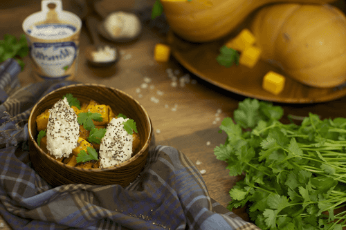 Baked pumpkin with rosemary is a true embodiment of Italian cuisine, where simplicity meets deep flavor. Legend has it that this recipe originated in cozy Tuscan villages, where pumpkin has always been a symbol of autumn abundance. When baked, the butternut squash acquires caramel sweetness, complemented by the spice of fresh rosemary and the richness of butter. Adding garlic enhances the aroma, while a pinch of sea salt balances the flavor palette. The finishing touch is cream cheese and chia seeds, which add a creamy texture and slight crunch. This dish is perfect for cozy family dinners as well as elegant festive meals, especially paired with a glass of white wine or a fresh green salad.