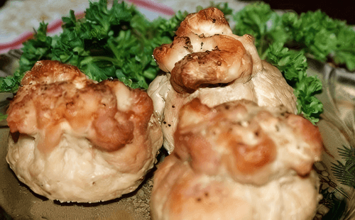 Place a spoonful of cheese on each cutlet, topped with sliced mushrooms.