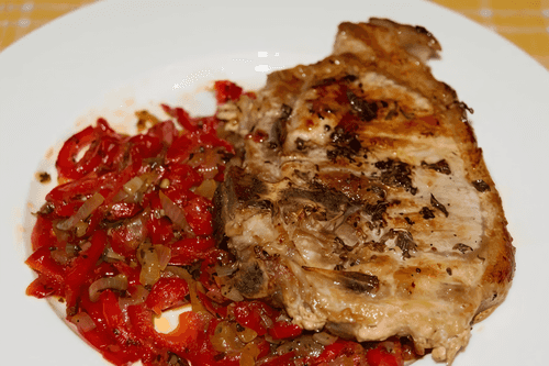 Serve the pork on a bed of peppers, lightly drizzled with the juice released from the meat and peppers.