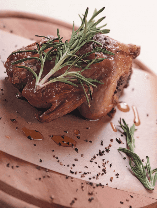 Place the prepared chicken carcasses on a baking tray with rosemary and garlic, drizzle with olive oil, and bake in the oven at 180 °C for 45–50 minutes until golden brown, occasionally basting with the fat that accumulates during roasting.