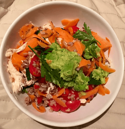 Layer in bowls: buckwheat, carrots, tomatoes, chicken. Top with avocado paste and garnish with torn parsley and sesame.
