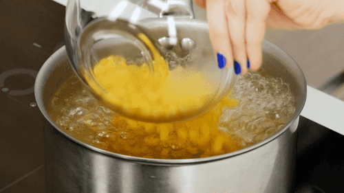 In a pot of boiling salted water (5-6 L per 1 kg of pasta and 50 g of salt), add the prepared pasta and cook until softened in vigorously boiling water, stirring occasionally with a wooden spoon to prevent sticking to the bottom. The ratio of 5-6 L of water to 1 kg of pasta is necessary because the water cools down after adding the pasta, and while it heats up, the pasta loosens, affecting their appearance and texture. Therefore, the higher the water-to-pasta ratio, the faster the water will boil after adding the pasta, resulting in better quality of the finished dish. Cooking time depends on the type of pasta: pasta takes 20-30 min, vermicelli 10-15 min, noodles 20-25 min.