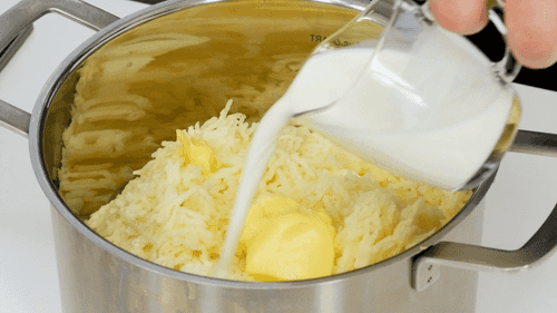 Add melted butter or margarine to the mashed potatoes, heat while stirring continuously, pour in hot boiled milk, and whip until fluffy.