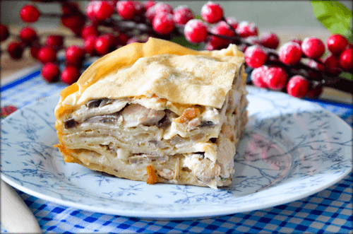 Place the pancake in a greased round cake mold or baking dish. Top with some mushroom sauce, pieces of chicken, and bacon. Layer the remaining pancakes and filling. Cover with greased foil and bake for 20 minutes. Cut into 4 pieces and serve with potatoes and boiled vegetables.
