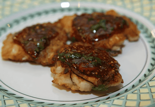 Heat vegetable oil in a deep pan or wok and fry the pancakes for 2-3 minutes on each side, then place them on paper towels to remove excess oil.
