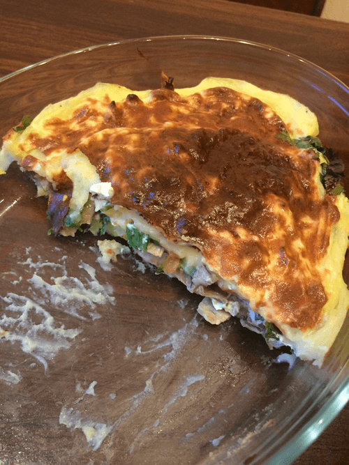 Grease a baking dish (glass) with olive oil. Layer everything: potatoes 50%, meat, mushrooms, greens, tomatoes, potatoes 50%, pour eggs over it. Basically, the dish is ready and should just be baked until golden brown for 15-25 minutes!