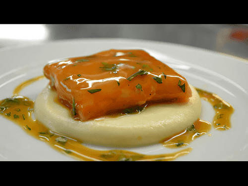 Take the fish out of the bag and carefully remove the skin. Heat the plate, place the puree in the center, put the fish on top, and enrich with sauce.