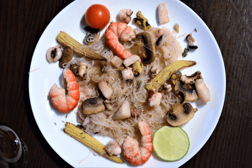 Wok noodles are so named because they are usually cooked in a special cone-shaped wok pan. In such a pan, the ingredients brown faster, and the noodles acquire a special taste . Wok is cooked with any fillers: as a base - chicken, pork, seafood, in addition there can be vegetables, sprouted grains, seeds and spices, soy sauce is often added to the wok. Also, any noodles can be chosen: rice, egg, buckwheat . Today we will cook a wok based on rice noodles with seafood, champignons and mini corn.