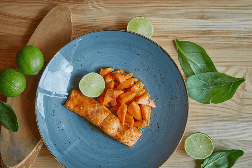 Salmon with chili-honey sauce and caramelized carrots is a vivid example of the harmony of sweet, spicy, and salty flavors characteristic of Chinese cuisine. This recipe combines tender salmon fillet baked to a golden crust with a spicy honey-chili sauce that adds zest. Caramelized carrots soaked in the sweetness of honey and the depth of soy sauce lend softness and richness to the dish. The history of the dish traces back to traditional Chinese techniques for processing fish and vegetables that highlight the natural flavors of the ingredients. It is recommended to serve it with lime, which adds fresh citrus notes, and watercress salad to complete the composition. This is not just a dish — it's a gastronomic journey that awakens taste buds and provides true enjoyment.