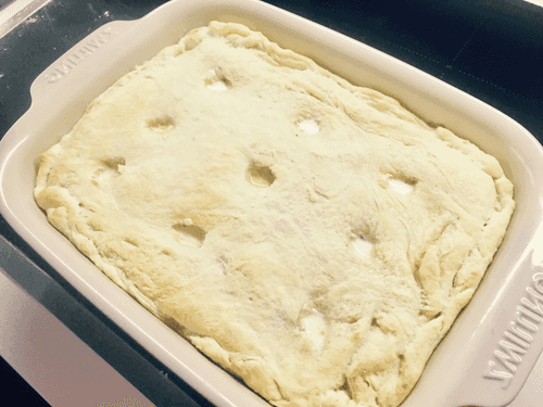 Bake in the oven at 160–170 degrees for 30–40 minutes or until the lid is browned and mozzarella starts bubbling in the holes.