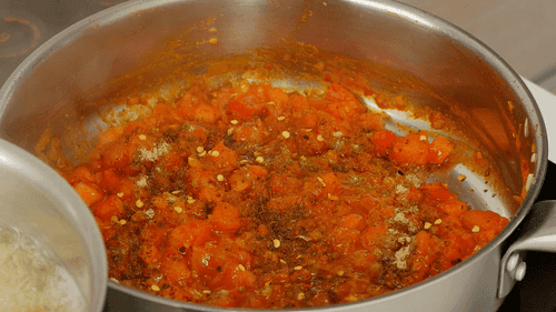Then add minced garlic, diced tomato, tomato paste, salt, sugar, black pepper, chili flakes, cumin, cardamom, and vinegar. Bring to a boil and simmer for 20 minutes.