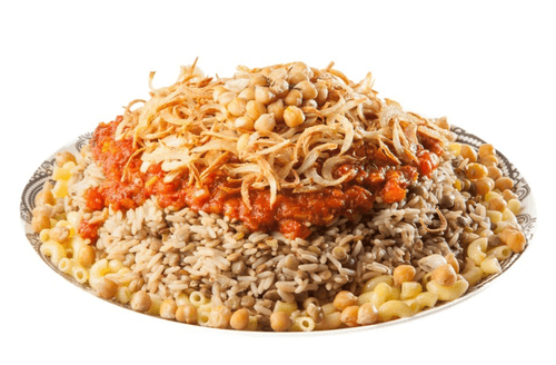 First, place boiled pasta on the plate, then rice mixed with lentils, pour tomato sauce over it, and top with fried onions and chickpeas.