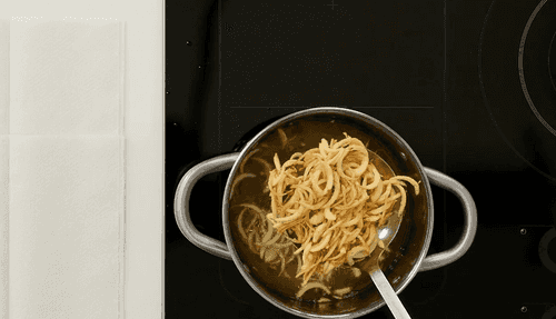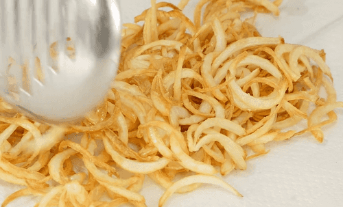 Cut the onion into strips, dry it, add a tablespoon of flour, and mix.