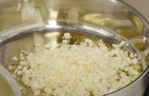 In another saucepan, heat vegetable oil, sauté chopped onion for 5-7 minutes until translucent, then add minced garlic.