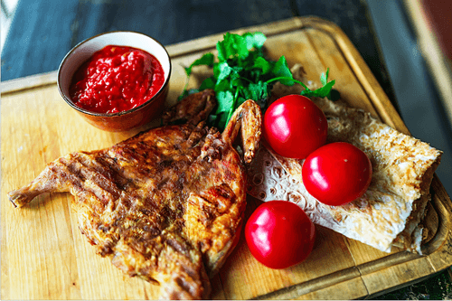 Chicken Tabaka with adjika is an embodiment of Georgian cuisine, where simplicity and richness of flavors merge into perfect harmony. The history of this dish traces back to Caucasian traditions, where it was cooked under a press to create a crispy golden crust. In this version, tender chicken meat is infused with aromatic spices and khmeli-suneli, while the addition of Megrelian adjika adds a spicy kick. Frying with sour cream softens the fiery character of the adjika, balancing the dish. The finishing touch is a garlic sauce that adds depth of flavor and highlights the juiciness of the meat. This dish pairs perfectly with Georgian wine and fresh vegetables, creating an atmosphere of a southern feast filled with aromas and warmth.