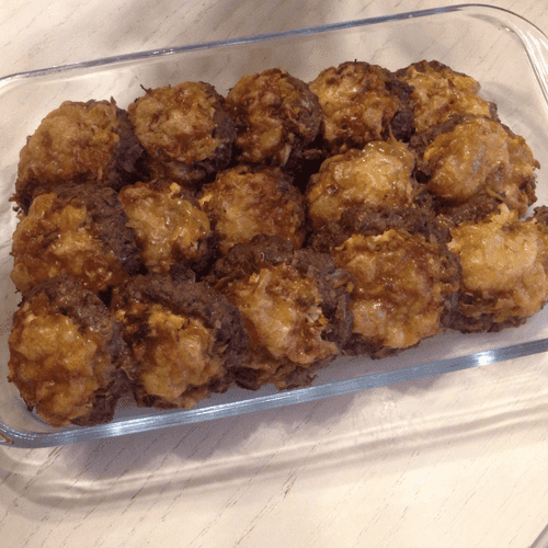 Form balls from the minced meat, place them on a baking sheet, and shape them into discs (flatten and make a dent in the center) - I got 16 pieces.