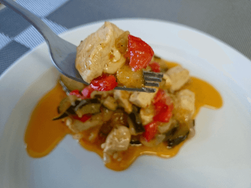 Chicken breast in sweet and sour sauce is a vibrant dish of Pan-Asian cuisine that combines tender meat, crunchy vegetables, and a tangy sauce. The sweetness of the pepper, freshness of zucchini, and rich flavor of chili create a harmony of textures and taste notes. This recipe is rooted in the Asian tradition of balancing sweet and sour notes, reminiscent of classic Chinese dishes. Its ease of preparation makes it an excellent choice for dinner, while the aroma of garlic and olive oil adds sophistication. The chicken soaked in spicy sauce turns out juicy, while the vegetables retain a pleasant crunch. The dish pairs perfectly with rice or noodles, highlighting its versatility. It's an ideal option for those looking to add exotic flavors to their everyday diet while enjoying the rich taste and vibrant colors of Asian gastronomy.