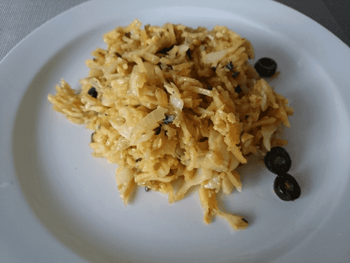 After boiling the cod, drain the water and tear it into small pieces. Add to the onion and garlic. Sauté for 3-4 minutes and then add the potato chips.
