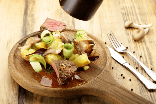 Dish decoration: place baked potatoes in the center, top with sautéed mushrooms, cut the steak in half and place on either side of the potatoes, drizzle meat with sauce and garnish with fresh cucumber and herbs.