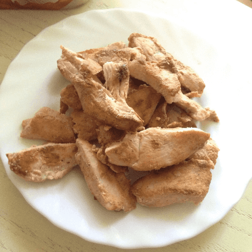 Diet chicken fingers in egg batter