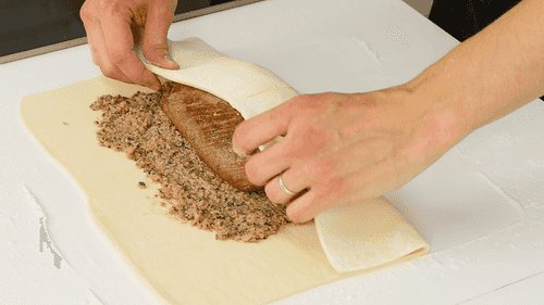 Roll out the dough on a floured surface, place mushrooms with pâté in the center, top with sautéed meat, and wrap it in dough.