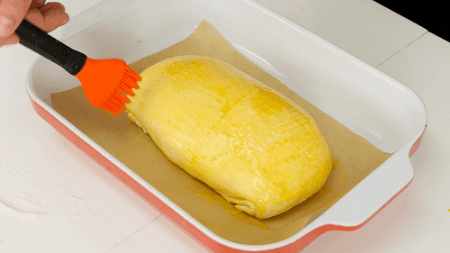 Transfer the pie to the baking sheet seam side down, brush with egg yolk, and make light cuts on the dough without cutting through to the filling.