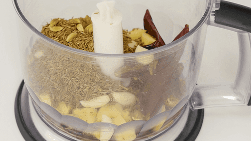 In a processor or mortar, grind garlic, ginger, dried chili, cumin, cardamom, and nutmeg to a uniform mass.