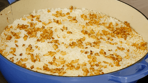 Spread the semi-cooked rice over the meat without mixing, then pour the yogurt and oil mixture on top, and sprinkle with fried onions.