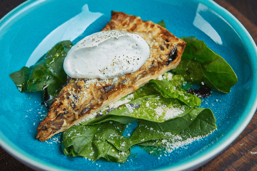 Place spinach leaves on a plate, then add a piece of pie and top it with a spoon of sour cream and truffle cream. Drizzle with green oil and sprinkle with ground pepper.
