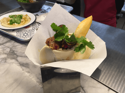 Spread hummus inside the warm pita and layer the ingredients: iceberg lettuce, Arabic salad, tahini, chicken, slices of pickled cucumbers, and again Arabic salad, tahini, chicken.