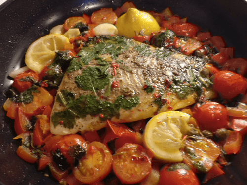 Fish with chili, sweet pepper and cherry tomatoes
