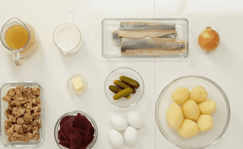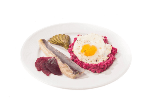 Place 2 spoons of labskause on a plate, top with 1 fried egg, and garnish with slices of pickled beetroot, pickles, and herring.