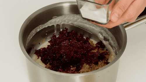Add onion with meat to the puree, 200 grams of chopped beetroot, a tablespoon of beetroot marinade, mix and add salt and pepper to taste.