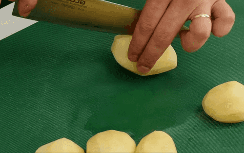 Peel the potatoes, cut them randomly, and boil until cooked. This will take about 20 minutes.