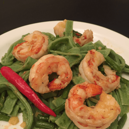 Pasta with Argentine shrimp and chili is a refined blend of Mediterranean elegance and vibrant South American temperament. Italian cuisine is renowned for its simple yet exquisite dishes, and this recipe is no exception. Tender shrimp infused with the aromas of lime, lemongrass, and garlic gain a spicy note from red chili, creating a delightful palette of flavors. The dish is complemented by spinach fettuccine pasta that harmoniously ties all the ingredients together while adding freshness. Young asparagus brings a crunchy texture and light sweetness, while olive oil unites everything into a symphony of flavors. This is the perfect dish for a Mediterranean-style dinner, offering a balance between the tenderness of seafood and the mild spiciness of spices.
