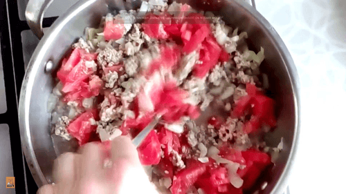 Sauté everything on low heat. When the minced meat changes color, add diced tomatoes. Cook until ready, season with salt and spices to taste, and at the end add finely chopped basil to the sauce. The sauce is ready.