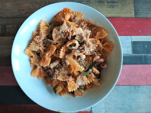 Farfalle pasta with octopus is a dish embodying the spirit of Italian cuisine, where seafood combines with aromatic herbs and delicate pasta. Farfalle, known as 'butterflies', perfectly hold the rich sauce made from tomato juice, wine, and saffron. The history of such recipes dates back to Italy's coastal regions, where fresh seafood is the foundation of gastronomic culture. The octopus adds a rich taste of the sea, while garlic and rosemary deepen the aroma. The composition is finished with fresh parsley and grated Parmesan, creating an elegant and balanced dish. This pasta is perfect for a dinner that immerses you in the atmosphere of the Mediterranean coast with its warm evenings and aromas of fresh spices.
