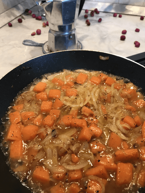 Fry in olive oil, add hot water from the pot with pasta, and cover with a lid.