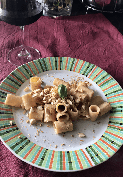 Fry chopped almonds separately in a pan. Sprinkle the finished paste with almonds instead of cheese.