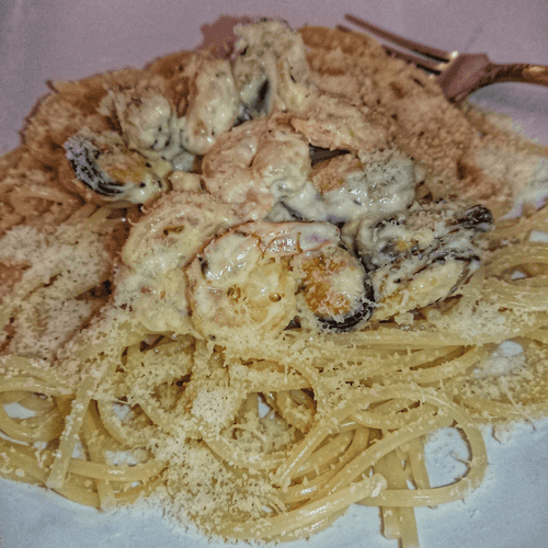 Italian pasta with shrimp and mussels is a refined dish that combines the sophistication of seafood with a rich creamy sauce. It originates from the coastal regions of Italy, where fresh shrimp and mussels have always been part of the culinary tradition. The thin strands of pasta perfectly absorb the thick sauce made from sour cream and cream, giving the dish a velvety texture. The aroma of dried oregano and basil envelops the delicate flavor of the seafood, highlighting their natural sweetness. Parmesan completes the composition by adding savory notes. This dish not only delights with its exquisite taste but also serves as a true decoration for any table, whether it's a romantic dinner or a festive reception.