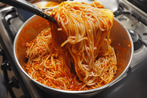 Put the spaghetti to boil. To prevent them from sticking, add a little olive oil.