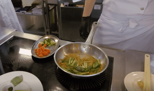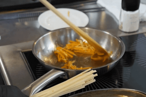 Add julienned carrots and shallots to the pan. Sauté for another 1-2 minutes. Add oil if necessary. Remove the garlic.