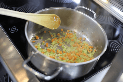 Heat the pan well. Add olive oil to it. Pour enough oil to completely cover the bottom of the pan. Add 30 grams of butter to it. Sauté chopped shallots, carrots, and celery stalks in this oil. Place the vegetables in a very hot pan, then reduce the heat to medium. Cook for about 5 minutes until the onion turns a strong golden color.