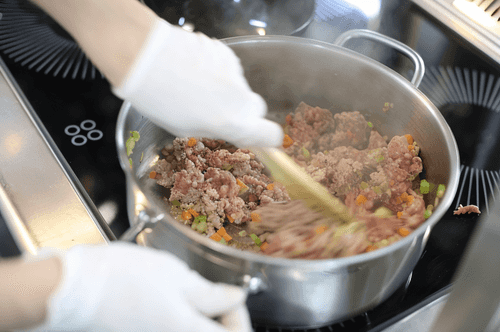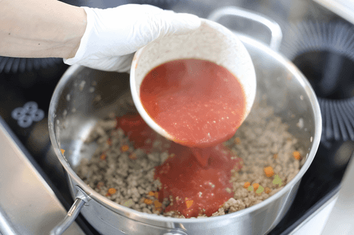After 5 minutes of cooking, add crushed tomatoes to the meat.