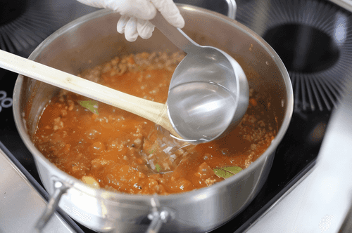 Increase the heat so that the tomato paste simmers slightly. After five minutes, add a ladle of water to the pan. After a few minutes, reduce the heat to low so that the stew simmers gently, cover with a lid and leave on the stove for three hours. Occasionally check the pan: if the stew thickens too much, dilute it with water.