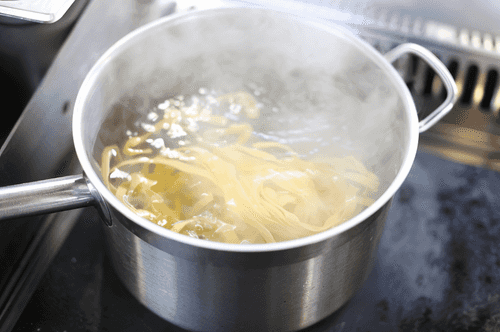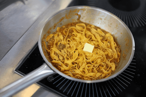 When the Bolognese is ready, you can cook the pasta. Homemade pasta should be slightly undercooked, meaning boil it for one minute less than required. If using store-bought pasta, also boil it for one minute less than indicated on the package. When the pasta combines with the ragù, it will simmer for a couple more minutes and reach the desired consistency in tandem with the sauce.