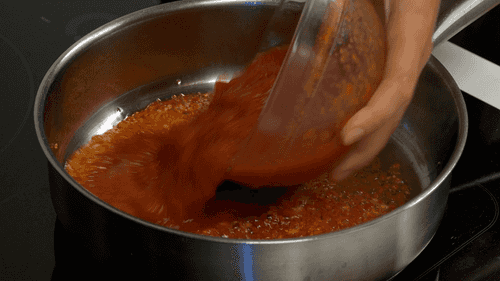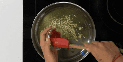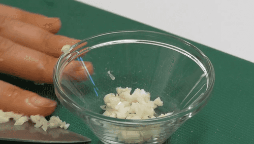 Heat olive oil in a pan and sauté minced garlic over medium heat for 30 seconds. Do not let it brown, or it will become bitter.
