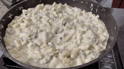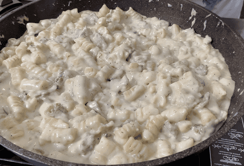 Pasta in creamy sauce with bacon is a simple yet exquisite dish of Italian cuisine that combines the tenderness of pasta, the richness of cream cheese, and the spiciness of fried bacon. The recipe's origins can be linked to Italian traditions of preparing pasta with various sauces, where creamy ingredients add softness and depth of flavor to the dish. Tender pasta absorbs the rich creamy sauce, while crispy bacon pieces add an appetizing texture and aroma. This dish is perfect for a cozy dinner, creating a sense of home warmth and gastronomic pleasure.
